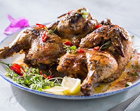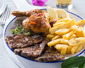 Chicken & Chops 232 1/4 Chicken, coal-grilled with olive oil, lemon & origanum and 150g skinny lamb chops. Served with crispy potato chips.