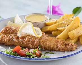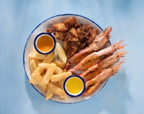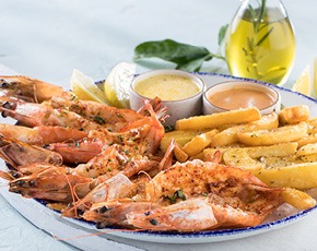 4 Queen prawns and 135g fried calamari with lemon butter and crispy potato chips.