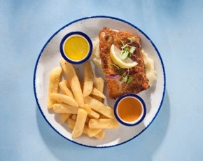 Deep-fried hake served with chips & lemon butter sauce.