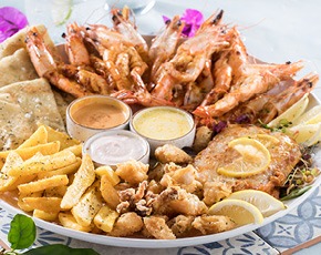 8 Queen prawns, kingklip & fried calamari, served with tarama, lemon butter, chips & pita bread.
